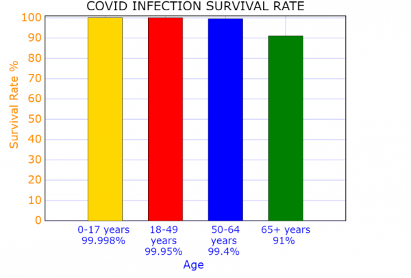 Many people simply fear the novel vaccine more than the novel virus which, according to the CDC, has an overall 99.4% survival rate for those aged 50-65 who get the infection. The odds go up as people get older but decrease if people are younger. For those under 18, the coronavirus fatality rate estimated by the CDC is 0.00002, which translates into a 99.98% COVID survival rate. In fact, for those under 18, the lifetime odds of being struck by lightning are higher than the odds of dying of the virus.