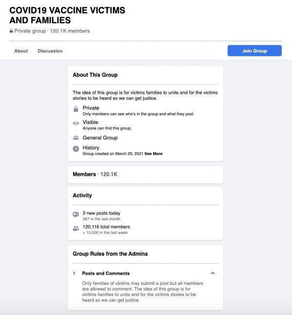 The group, “COVID19 VACCINE VICTIMS AND FAMILIES,” had over 120,000 followers when it was shut down and had been gaining more than 10,000 followers per week.