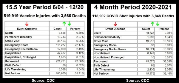 To give some perspective to these recorded numbers, and show how criminally evil it is to claim that none of these deaths or injuries are caused by the injections, the total deaths now recorded following experimental COVID injections since December, 2020, is more than the recorded deaths following vaccines for the previous 15 and a half years (source) before the experimental COVID shots were unleashed against the public.