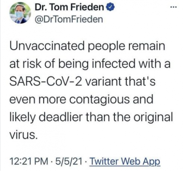 Former CDC director Tom Frieden employed an offshoot of the “social norm” tactic along with “emphasizing disease danger” in a recent tweet which painted unvaccinated people as “infected” spreaders of supposedly deadly variants.