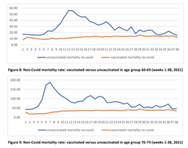 In previous years, each of the 60-69, 70-79 and 80+ groups have mortality peaks at the same time during the year (including 2020 when all suffered the April Covid peak at the same time). Yet in 2021 each age group has non-Covid mortality peaks for the unvaccinated, at a different time, namely the time that vaccination rollout programmes for those cohorts reach a peak.”